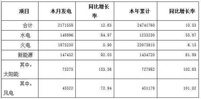 (一)发电量情况。10月份当月,全省发电量217.16亿千瓦时,同比增长12.63%,累计发电量2474.18亿千瓦时,同比增长10.53%。